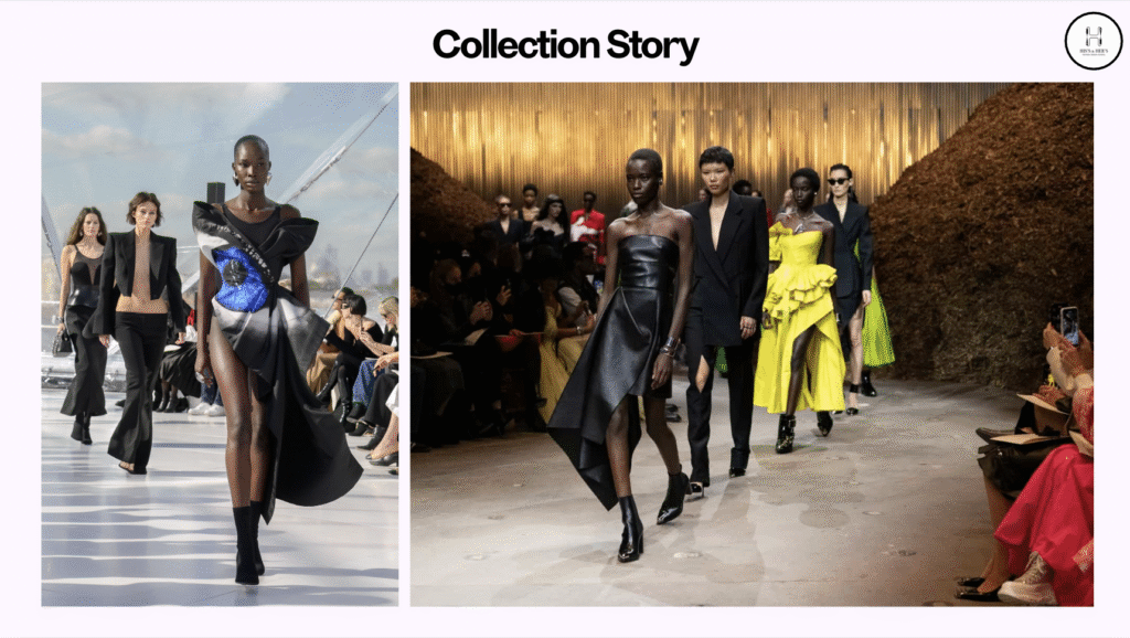 2. Collection ပုံပြင်ဖန်တီးခြင်း (Collection Story): ဖက်ရှင်ပြပွဲတစ်ခုကို စဉ်းစားကြည့်ပါ။ အဖွင့်အင်္ကျီ (Opening Look)၊ အဓိက အင်္ကျီများ (Statement Pieces)၊ နေ့စဉ်ဝတ်ဆင်နိုင်သော အင်္ကျီများ (Everyday Wear)၊ ပြီးတော့ ပိတ်တဲ့ အင်္ကျီ (Closing Look) စသဖြင့် Collection တစ်ခုလုံးကို ပုံပြင်တစ်ပုဒ်လို ဖန်တီးရပါမယ်။
