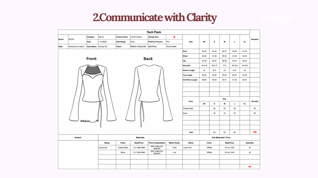 ááŽáááŻááşá¸áĄááąá¸á áááşááťáŹá¸ááᯠáĄááźááˇáşáĄá áŻáśááąá¸ááŤ: áááŻááşáá˝á˛ááŹá¸áá˛áˇ ááŽáááŻááşá¸ááŻáśá áś (Design Sketch) áĄááźááş áááşá¸áááŹáááŻááşá¸áááŻááşáᏠááŻáśááźááşá¸ (Technical Sketch)á áááŻááşá¸ááŹáážáŻáááŹá¸ (Measurement Chart or Spec Sheet)á áĄááşááťáŻááşáááşá¸ááŻáśá áś (Stitching Details)á áĄáááşáĄááťááŻá¸áĄá áŹá¸ (Fabric Type)á áĄááźáŹá¸ áĄááŻáśá¸áĄááąáŹááşáá ášá ááşá¸ááťáŹá¸ (Trims and Notions) á ááŹáá˝áąááᯠááááááťááť ááąáŹáşááźááŹá¸áá˛áˇ Tech Pack (áááşá¸áááŹáĄááťááşáĄáááşáĄááŻááş) ááᯠááąá¸áááŻáˇ áááŻááŤáááşá